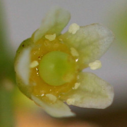 Flowers and fruits of Anacardiaceae: Flower of the pink peppercorn tree (Schinus terebinthifolia, left), fruit and subtending hypocarp of the cashew (Anacardium occidentale, center), and young mango (Mangifera indica, right) fruit showing the funicle (left section). ©