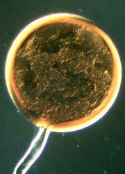 Figure 3: Spore of Archaeospora leptoticha (isolate NC176) cracked open under a microscope cover slide. The spore wall is multilayered with a richly ornamented surface. Photo © Dirk Redecker, isolate courtesy of J. B. Morton at INVAM. Uncracked spore diameter approximately 200 µm.