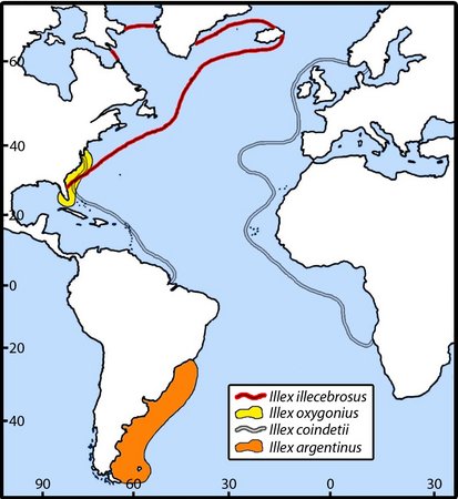 Species of Illex are found only in the Atlantic Ocean -- Western Atlantic Ocean from equator to Iceland and from southern Brazil to Patagonia, and eastern Atlantic from 20°S to 60°N, including Mediterranean Sea. These species are generally confined to continental shelf and slope areas, or nearby oceanic waters, perhaps because of their habit of sitting on the bottom at depths of up to 1000 m.