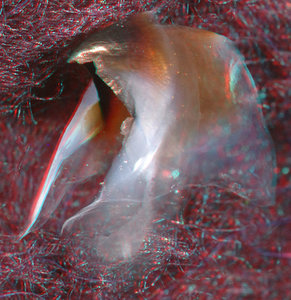 About anaglyph 3D: Photographs here are in 3D, using anaglyph techniques which combines two photographs one in red and the other in cyan (blue + green) color. To get the 3D effect, you must use glasses with red and cyan lenses (filters) over your regular glasses. The form of the beak is far easier to interpret in 3D and we strongly recommend to the viewer that the glasses be obtained (this is especially helpful when viewing enlarged images - i.e. click on the image). These beak photographs were made using Red and Cyan Anachrome Aviator Glasses (see: http://www.anachrome.com/glassbuy.htm or http://www.amazon.com) which cost under $10.00 (USD).