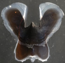Figure. Views of the lower beak of M. atlantica. Left - Oblique view, 127 mm ML. Middle - Top view, 127 mm ML. Right - Top view, 53 mm ML.