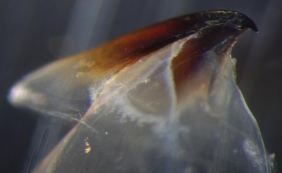 Figure. Side views of the upper beak of M. atlantica. Left - 127 mm ML. Right - 53 mm ML, size is indicated by the tip of an insect pin in the photograph.