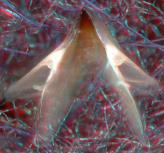 | M. atlantica, sex ?, 53 mm ML, 0.6 mm LRL, near Azores. Photographs by R. Young. | M. atlantica, immature male, 72 mm ML, 1.1 mm LRL, Gulf of Mexico. Photographs by R. Young. | M. atlantica, mature male, 127 mm ML, 1.6 mm LRL, Gulf of Mexico. Photographs by R. Young. |